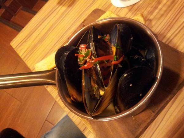 Mussels for him, $18.50++. Ordered the spicy chilli version, and the sauce was a delectable dip for the accompanying sticks of bread (he would have 3 servings). Mussels were soft and tender, you could "chew" them with your tongue.